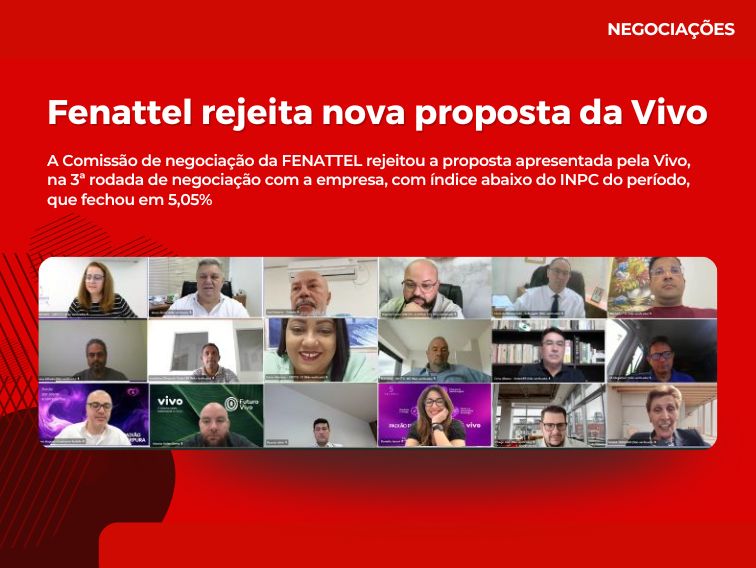 A Comissão de negociação da FENATTEL rejeitou a proposta apresentada pela Vivo, na 3ª rodada de negociação com a empresa, com índice abaixo do INPC do período, que fechou em 5,05%.